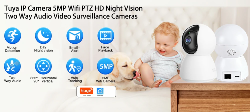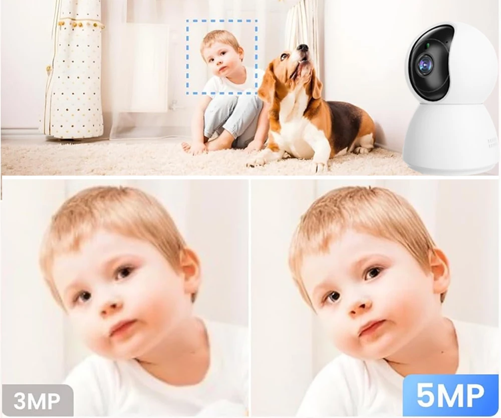 This smart IP camera is designed to help parents monitor their baby with confidence and clarity. Featuring a 5MP resolution, 360° pan and tilt and automatic tracking, it allows real-time viewing via WiFi on compatible devices. With night vision and two-way audio, it supports day and night monitoring for added peace of mind.
